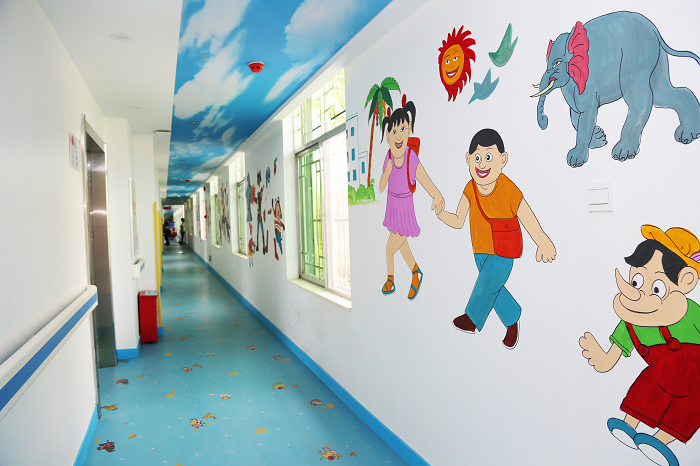 近日,隨著醫(yī)院的改造升級,兒科病房一改往日單調(diào)刻板的面貌,變身童趣十足的游樂園。整個科室以兒童喜愛的鮮亮色彩作為主色調(diào),并增添了許多人性化設(shè)計,將原來白色墻面豐富為彩色亮麗、充滿童趣的墻體,走廊處畫上了各類卡通圖案,營造了溫馨可愛的氛圍,小朋友們就診時如同置身于卡通樂園,充分體現(xiàn)了現(xiàn)代化專科醫(yī)院室內(nèi)設(shè)計的人文理念。